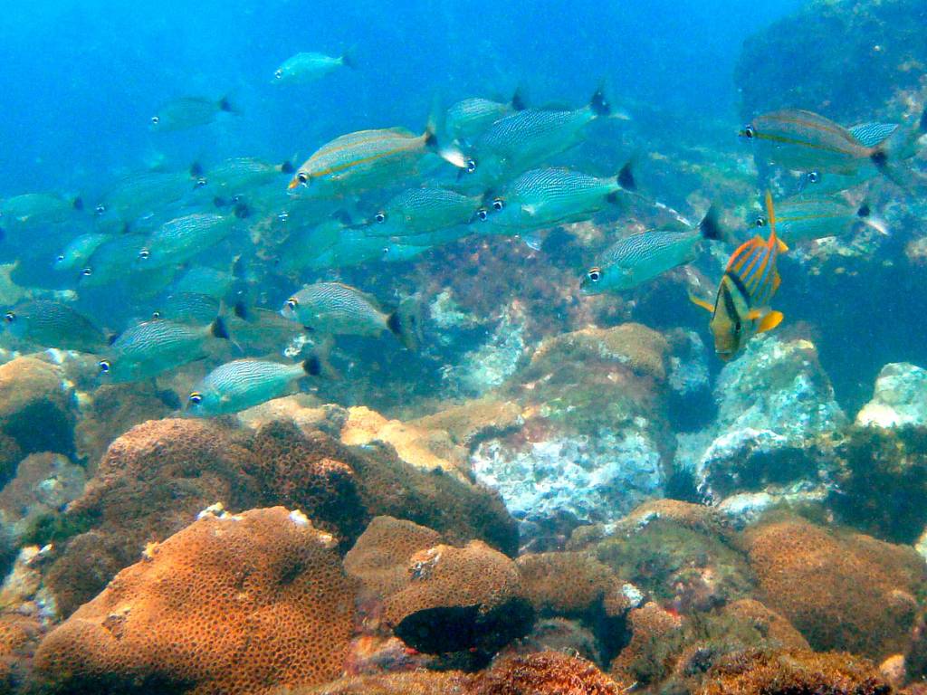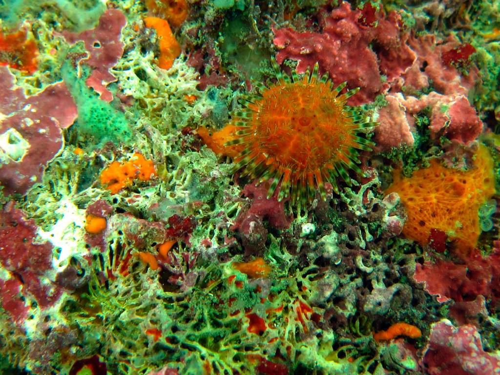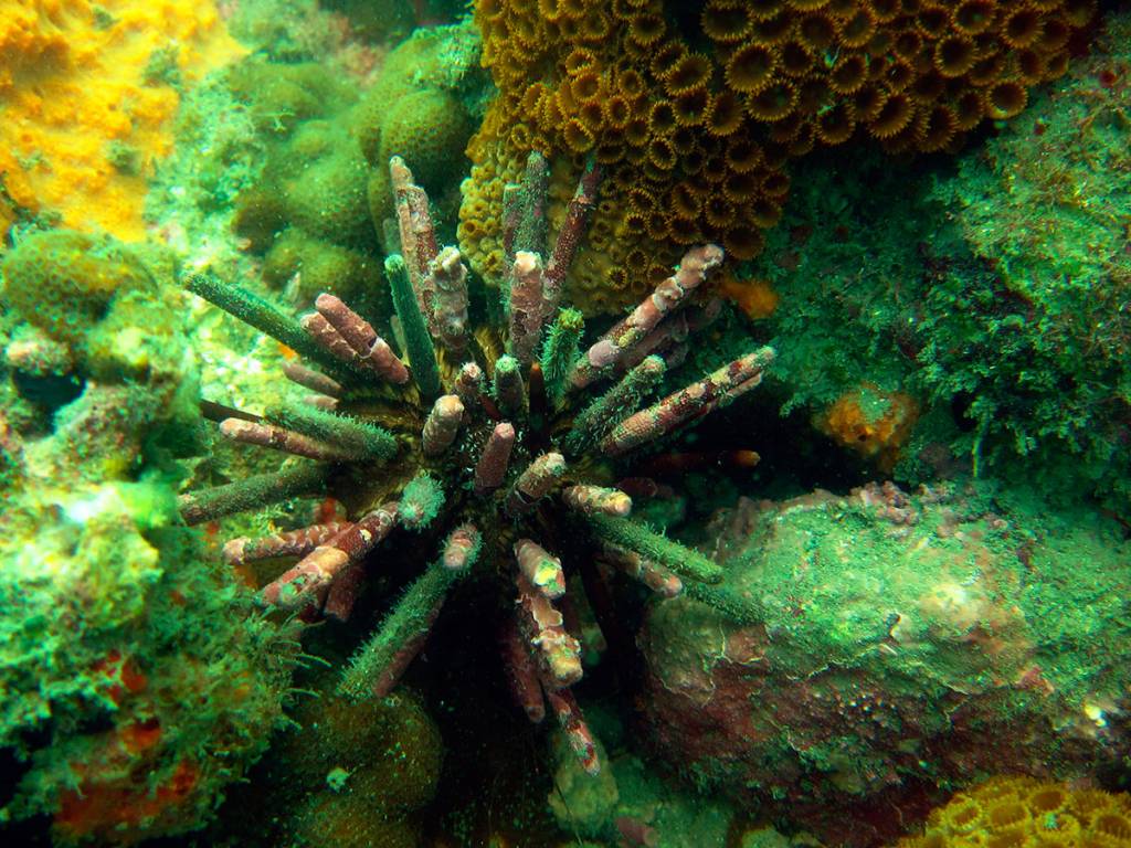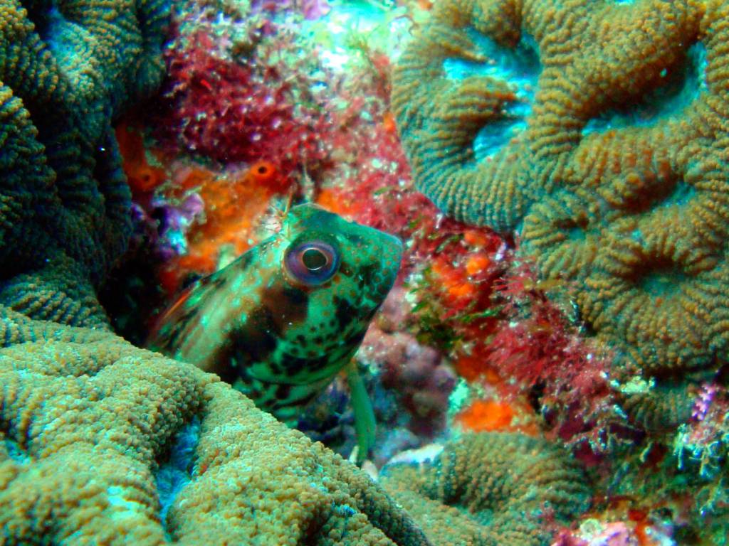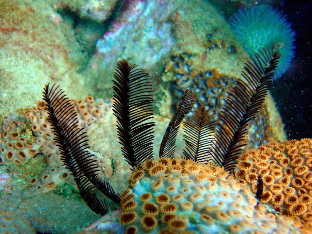 Temos muitos corais-cérebro, coral-babão, coral-sol e algumas outras espécies, além de gorgônias vermelhas.